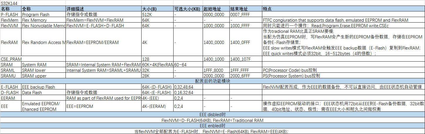 非易失性闪存可以执行程序代码、存储数据或备份模拟的 EEPROM 数据。此内存位于 P-Flash 的一个独立分区中。FlexNVM总共64KB可以配置成EEPROM或者D-Flash,EEPROM+D-Flash=64KB,S32K144 的 FlexNVM 作为 EEPROM 与 D-Flash 的区别主要在于